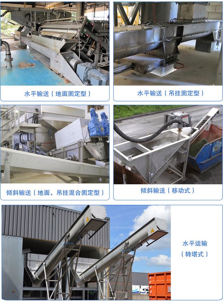 主要用于污水處理、垃圾回收中,廣泛用于化工、食品、醫藥、造紙、飲料等行業輸送附著力強、膏狀粘性物料(如化工原料、廢紙漿、麥芽、污泥、等)纏繞材料(如生活垃圾)。