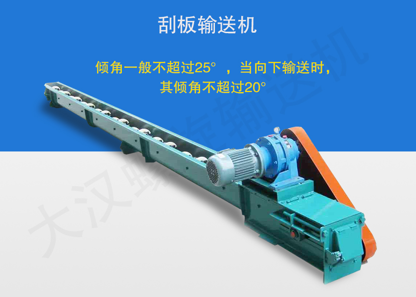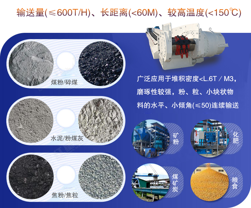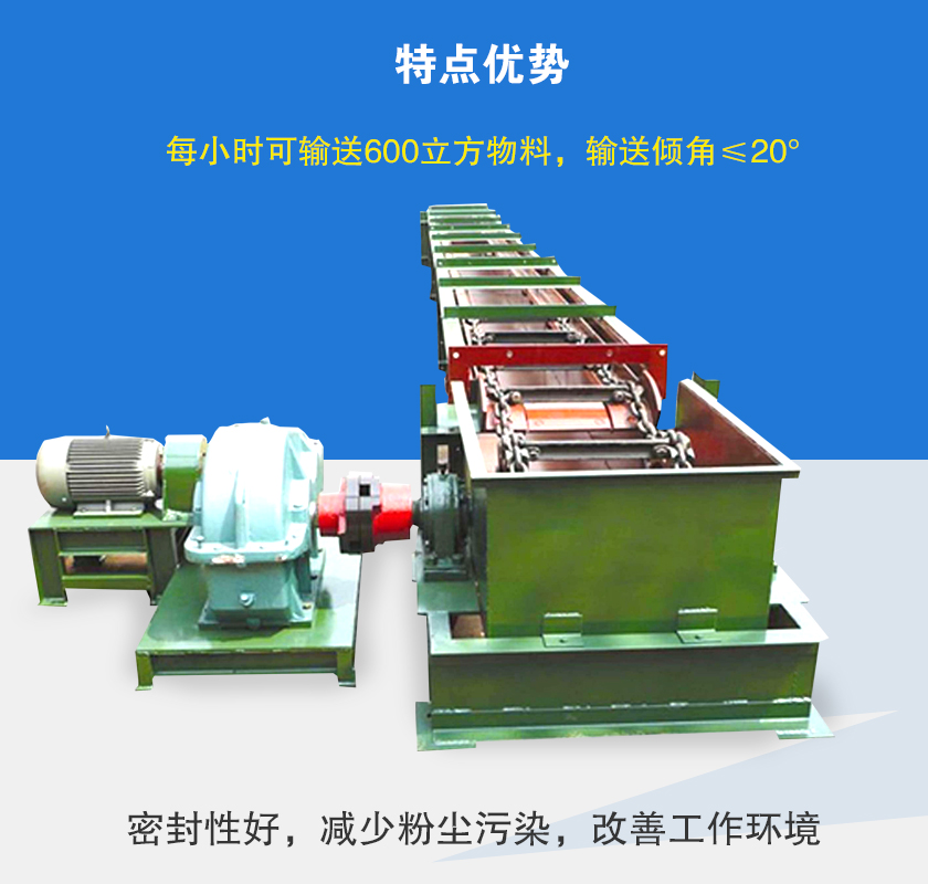 刮板輸送機廣泛應用于堆積密度<l.6t/m3,磨琢性較強,粉、粒、小塊狀物料的水平、小傾角(≤50)連續(xù)輸送,如煤粉、碎煤、水泥、粉煤灰、焦粉、焦粒、礦粉、化肥、糧食等大輸送量(≤600t/h)、長距離(<60m)、較高溫度(<150℃)物料的連續(xù)輸送。