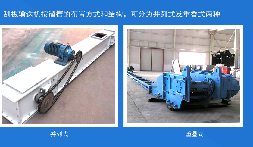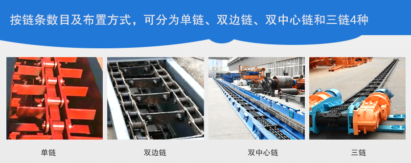 刮板輸送機按溜槽的布置方式和結構,可分為并列式及重疊式兩種,按鏈條數(shù)目及布置方式,可分為單鏈、雙邊鏈、雙中心鏈和三鏈4種。